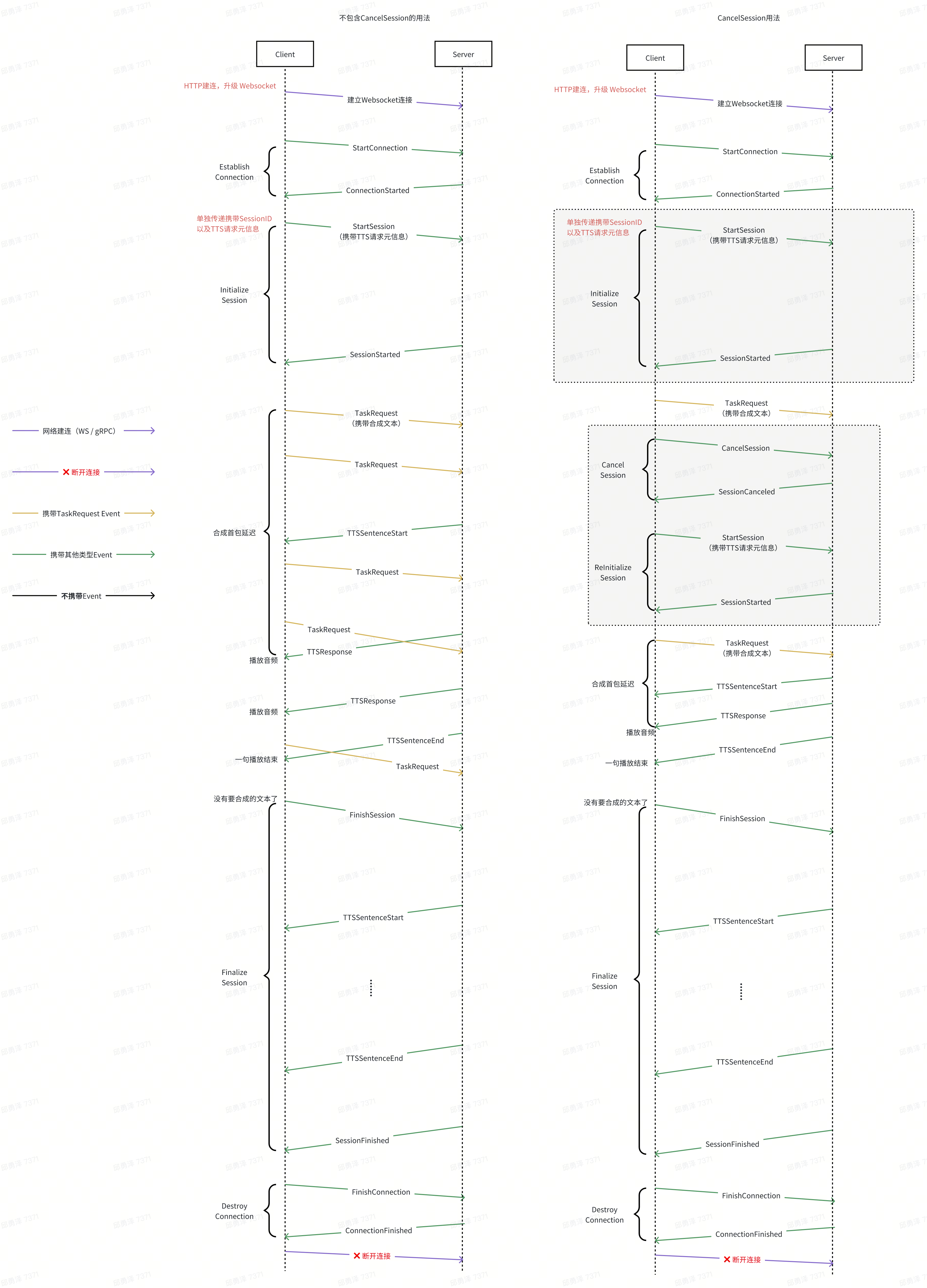 该接口会处理碎片化的文本或者过长的文本,整理为长度合适的句子。因此最大的优势是平衡延迟和合成效果。 在对接大文本模型时,推荐将流式输出的文本直接输入该接口,而不要额外增加切句或者攒句的逻辑。同样的文本调用一次该接口与多次调用合成接口相比,前者会更为自然,情绪更饱满。 推荐使用链接复用的方式接入,在每次使用时只需要建立一次websocket连接,即发送startconnection,在收到ConnectionStarted后,即为链接建立成功。此时,发送startsession,通过taskrequest发送文本,同时接收音频。在没有文本可以发送时,需立即发送finish session。如果还有文本发送需要合成,此时无需断开链接,待收到SessionFinished后(必须),重新发送startsession,开启新一轮session。如果再没有文本需要合成,即可发送finish connection断开链接。具体流程可参考该页交互示例**。** 注意,同一个WebSocket链接下支持多次session,但不支持同时多个session。